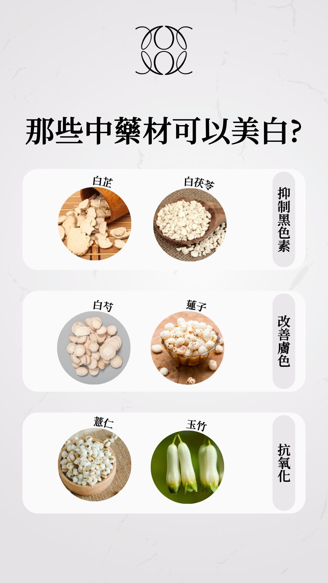 在追求白皙無瑕的肌膚之路上,傳統中醫藥材以其獨特的美容功效,歷經千年流傳,結合現代科學研究,成為天然的美白良方。作為一個立足香港,專注融合中醫智慧與尖端科技的奢華護膚品牌,我們以珍貴中藥材為靈感,打造高效且溫潤的康膚體驗。今天,讓我們一同細說那些在中醫經典中廣為推崇,且現代實證支持的中藥材——白芷、白茯苓、白芍、蓮子、薏仁與玉竹,如何助你展現淨透亮白的自然光采。