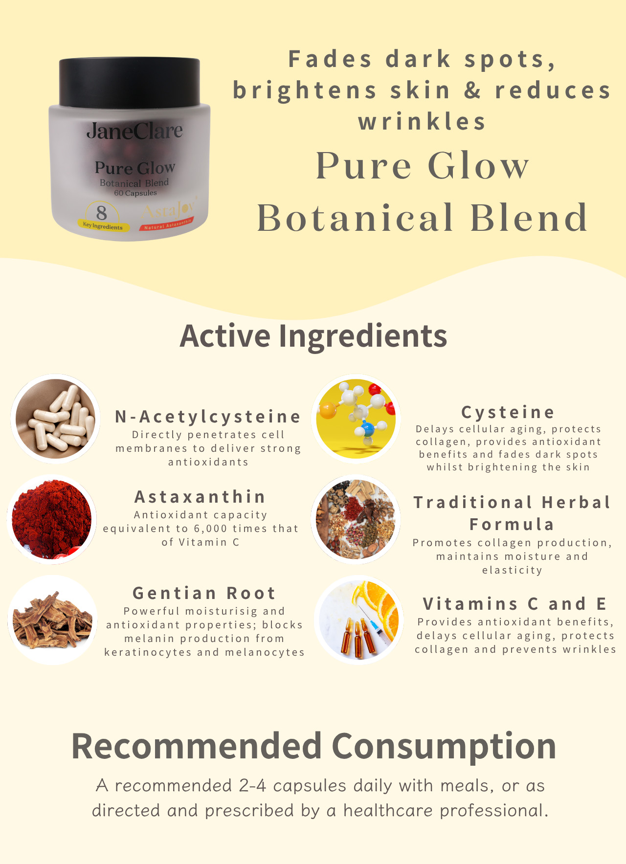 Dual-pathway formula blocks melanin, creating radiant skin. NAC, cysteine, astaxanthin, mulberry extract, and vitamins C & E reduce pigmentation and photoaging. Chinese herbs regulate melasma, repair acne marks, and prevent sensitivity.
