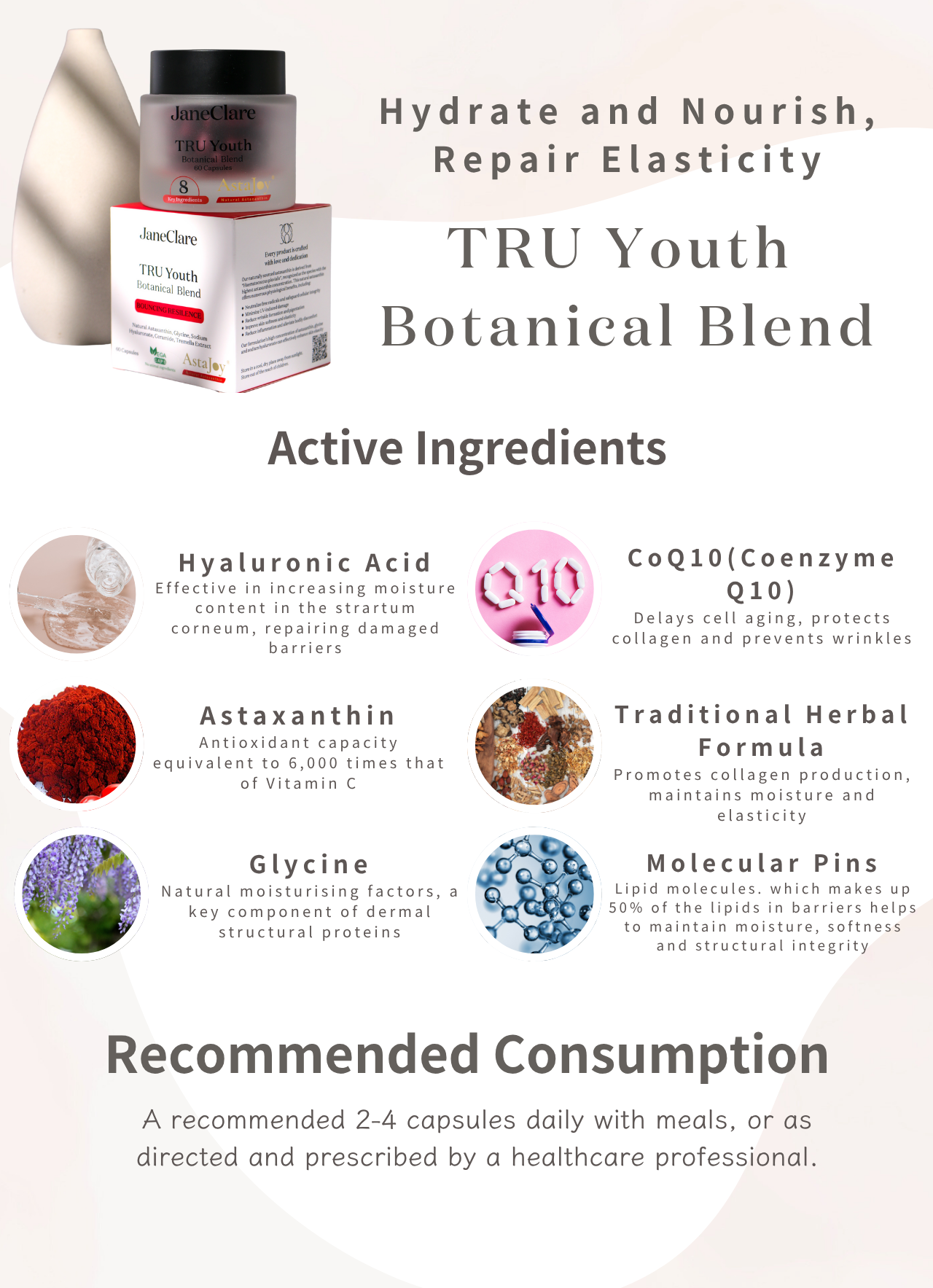 Advanced formula with Chinese herbs revitalizes skin, targeting sagging and dryness. Glycine, CoQ10, and sodium hyaluronate boost collagen and hydration. Astaxanthin fights free radicals, while Tremella, Poria, Dioscorea, and Ophiopogon enhance moisture and radiance.
