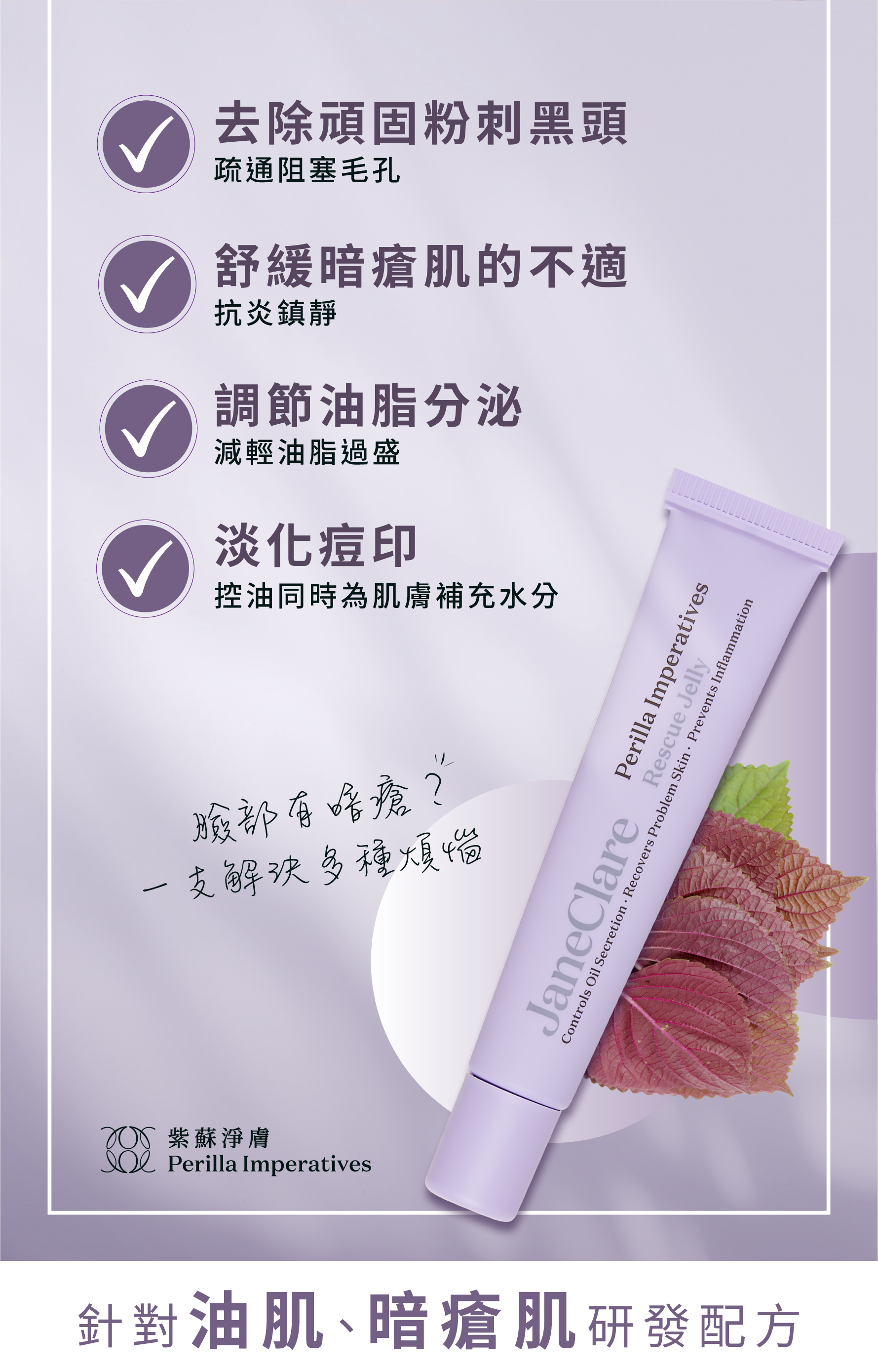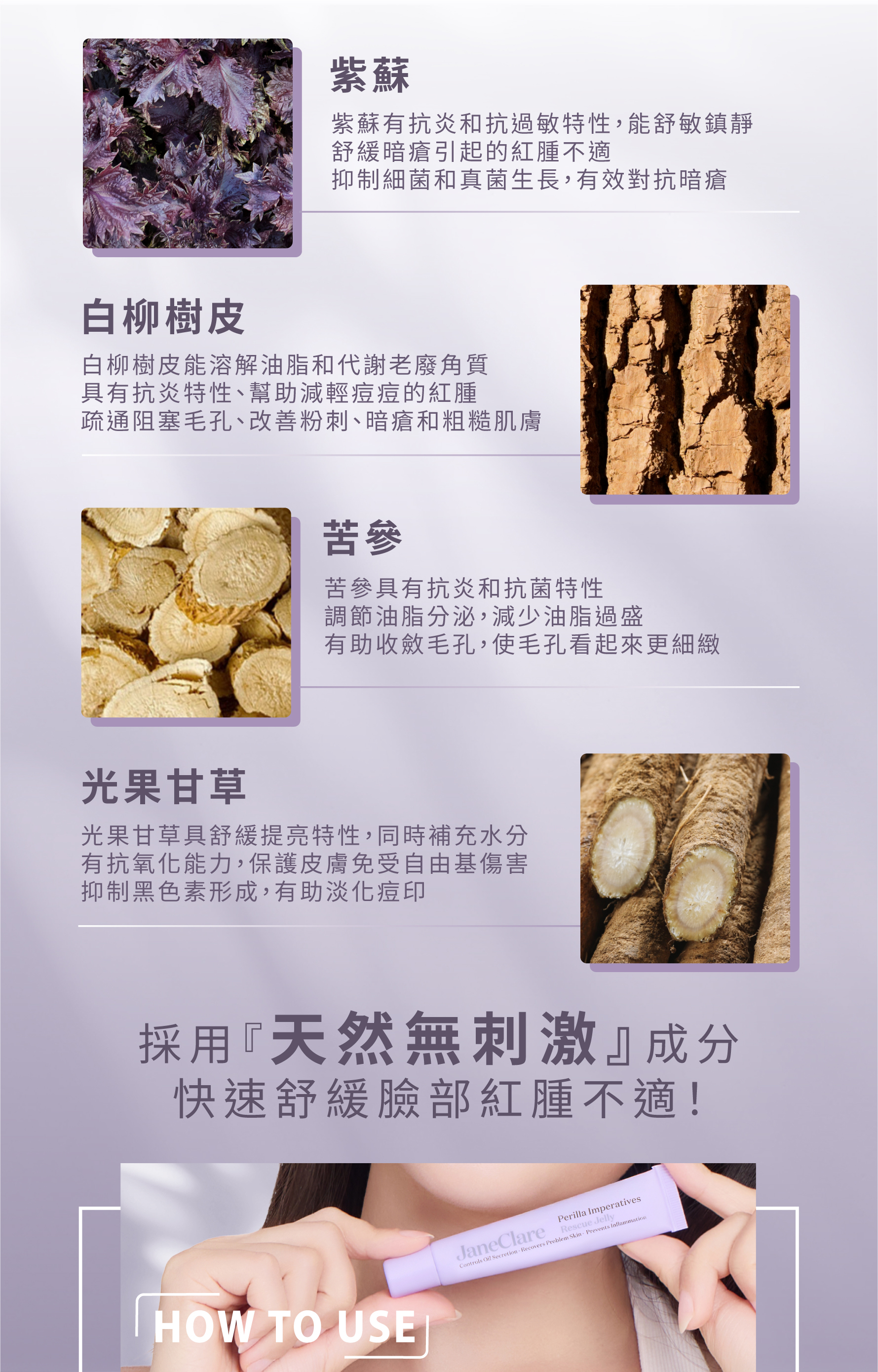 ·紫蘇消炎淨痘肌配方,糅合白柳樹皮、苦參及光果甘草等。