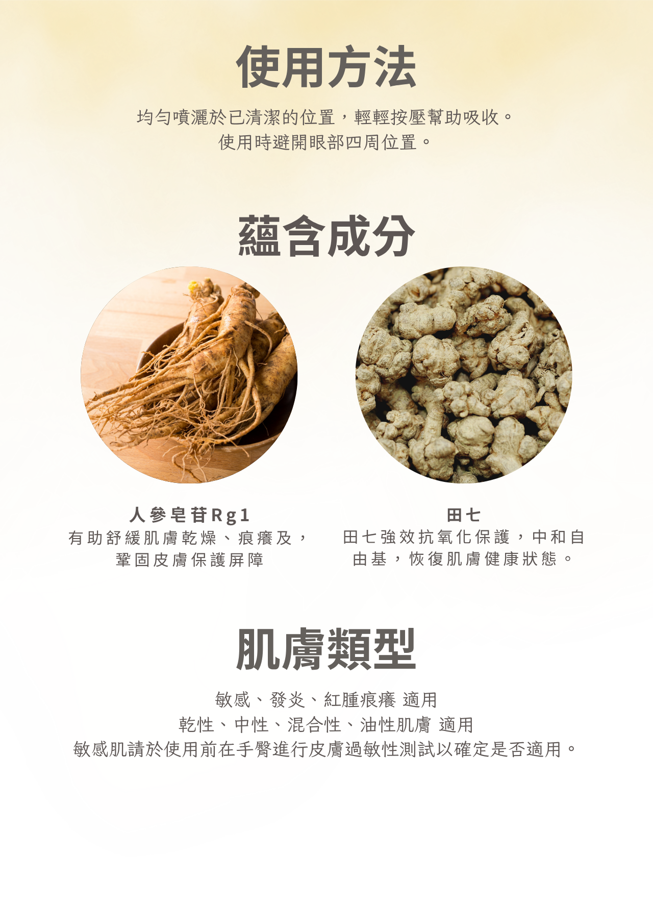 ·田七強效抗氧化保護,中和自由基,改善粗糙暗沉,恢復肌膚健康狀態。