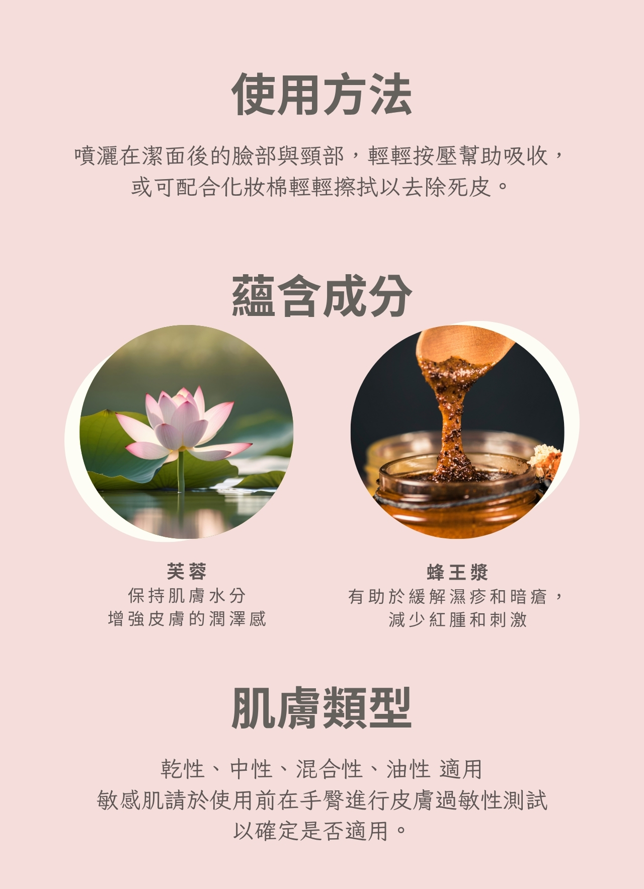 ·調節肌膚的水油平衡及酸鹼度, 為後續的護膚步驟作準備,提升吸收效果。