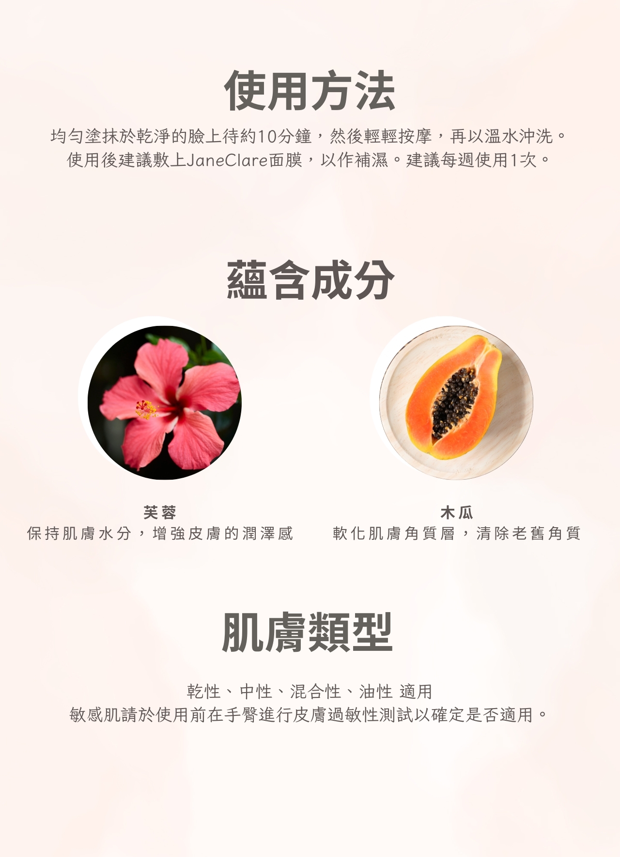 ·芙蓉溫和溶解角質配方,糅合木瓜酵素、白柳樹皮及甘草等。