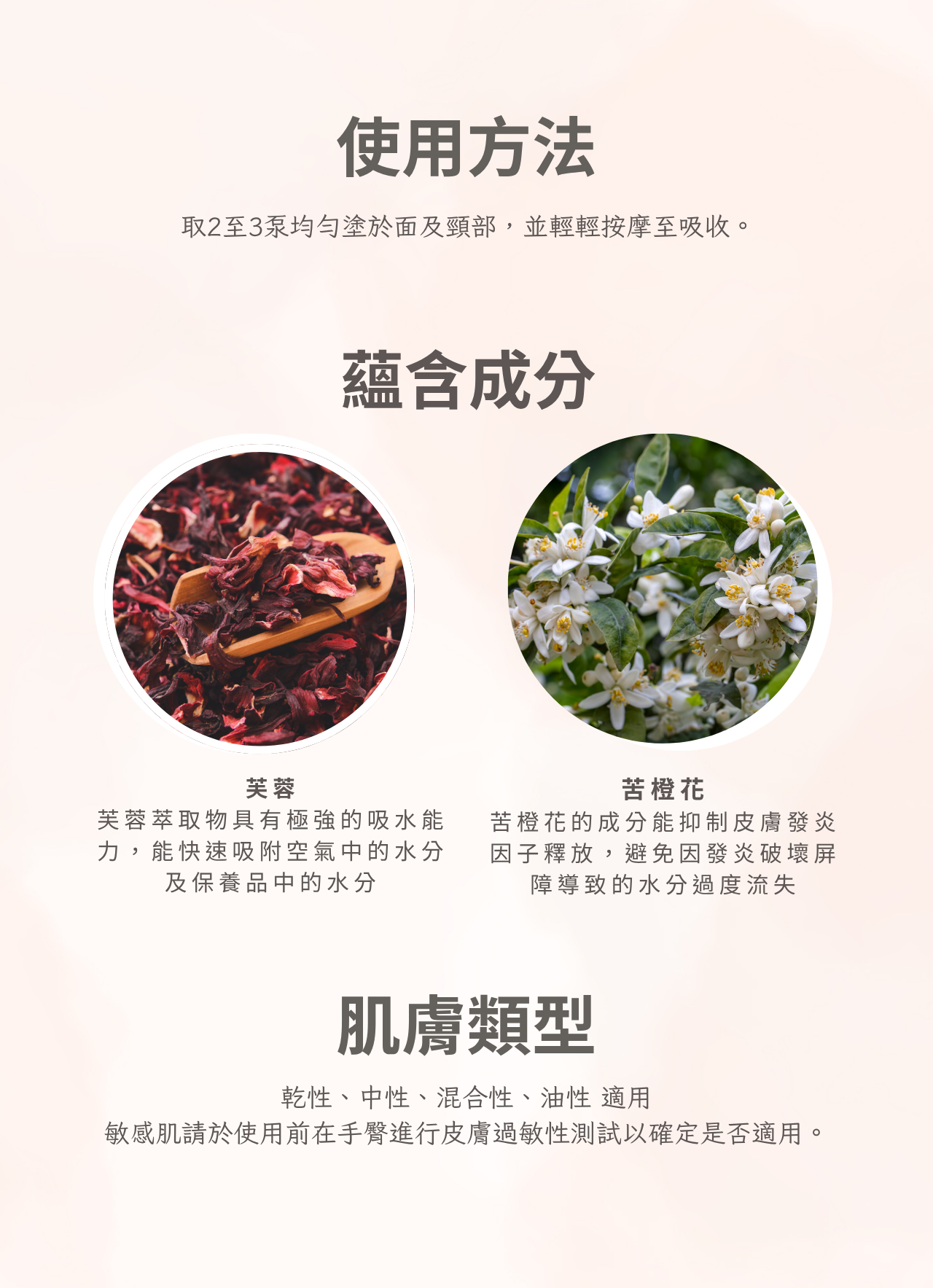 ·芙蓉煥發保濕配方,糅合光果甘草、銀杏及精氨酸/賴氨酸多肽等。