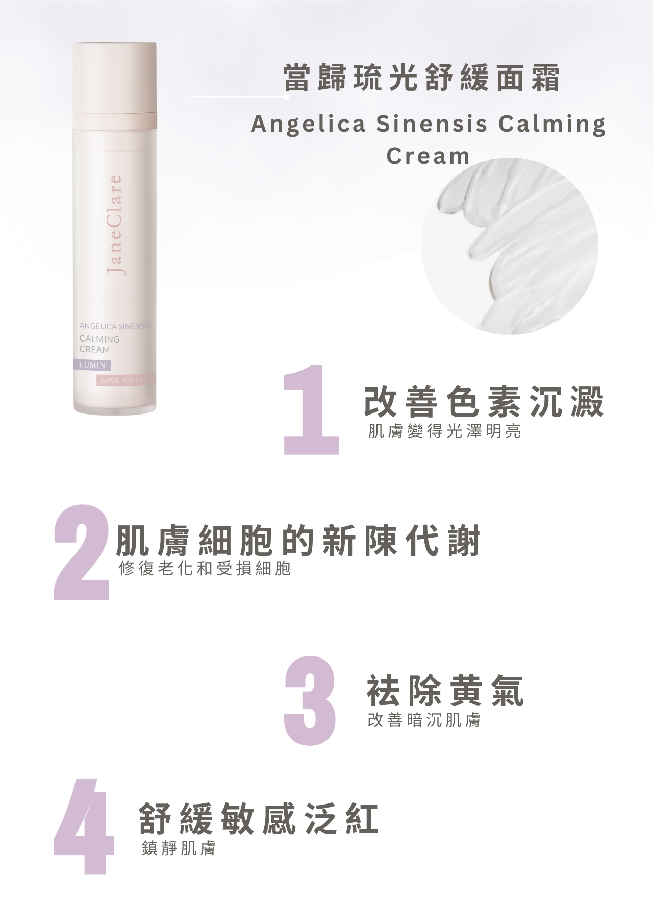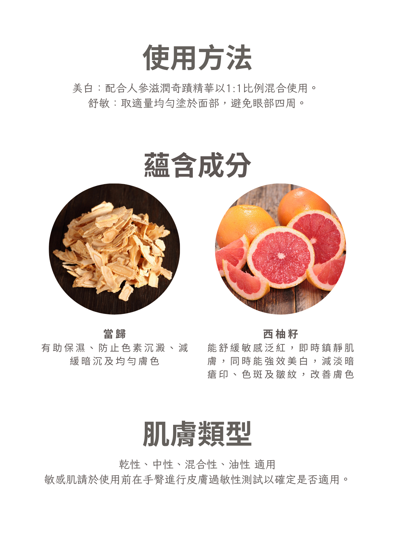 · 當歸美白舒敏配方,糅合西柚籽、甘草等植物萃取