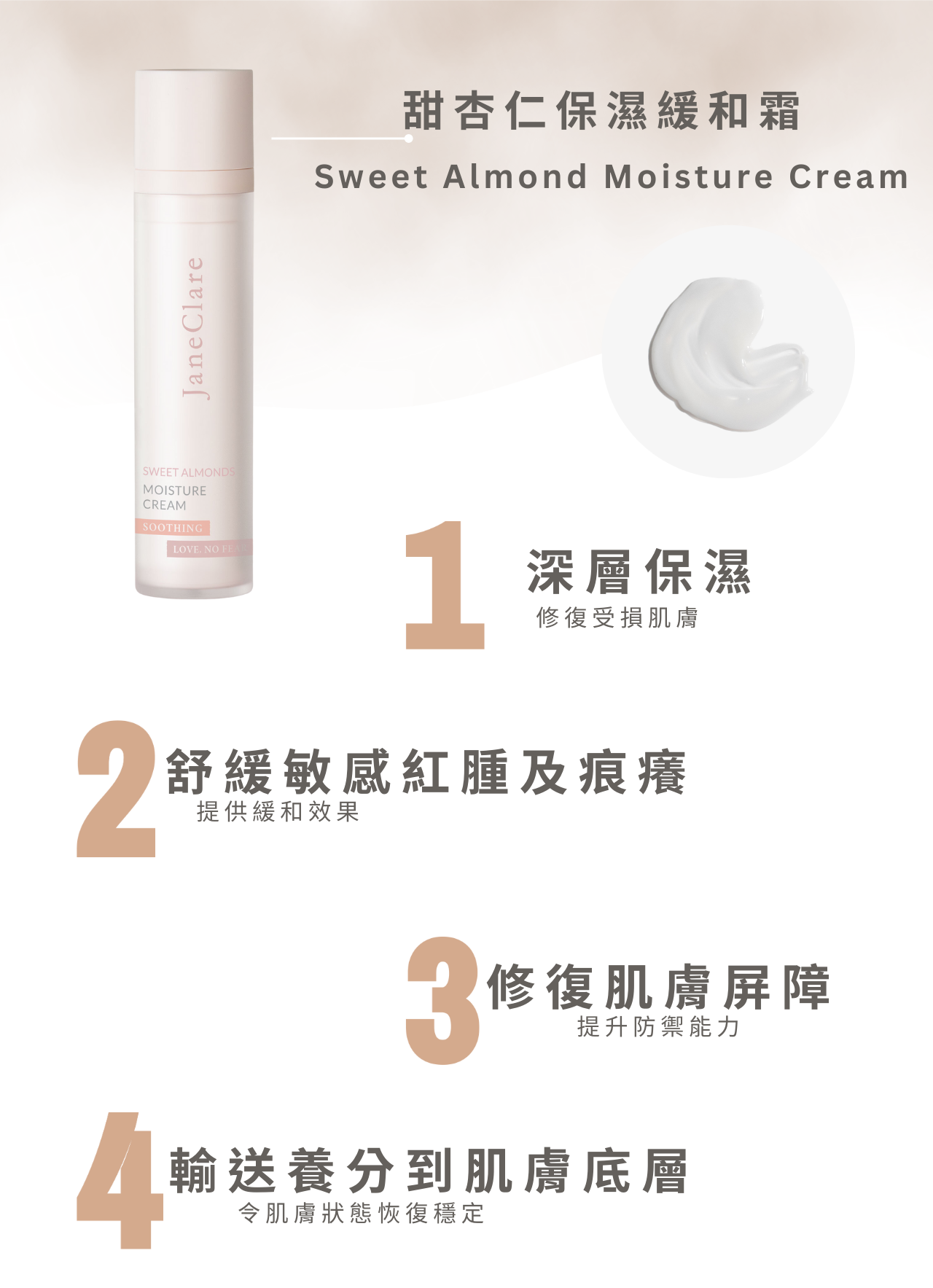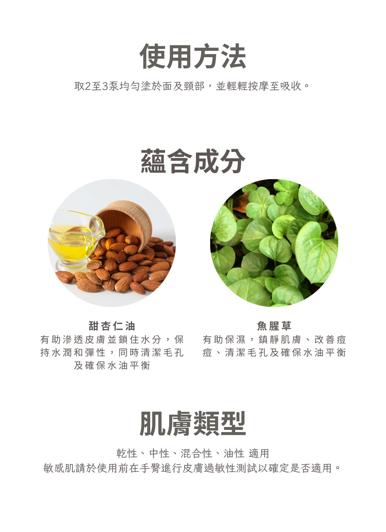 .甜杏仁保濕緩和配方,糅合魚腥草、銀杏等植物萃取