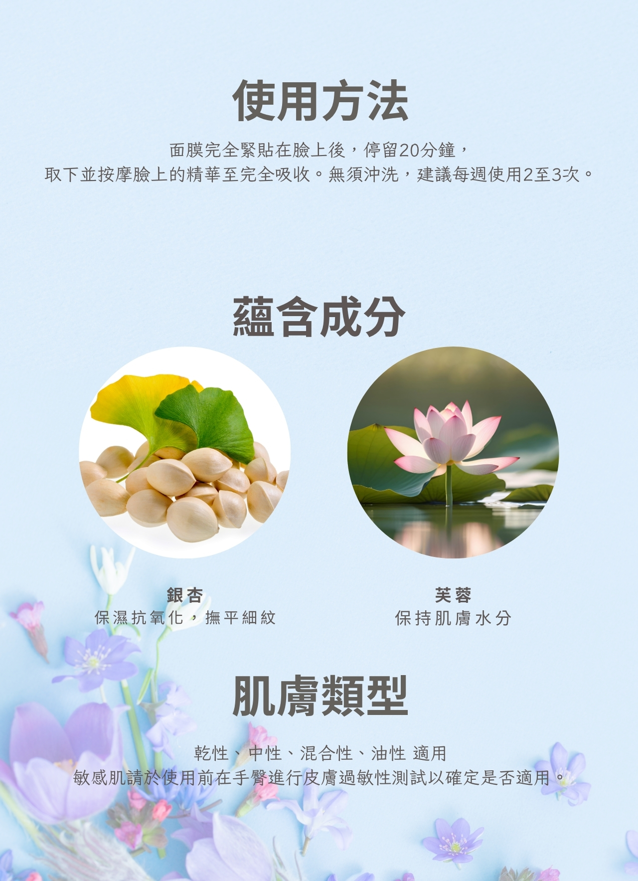 ·芙蓉煥采亮肌配方,糅合銀杏、光果甘草及苦橙花油等。