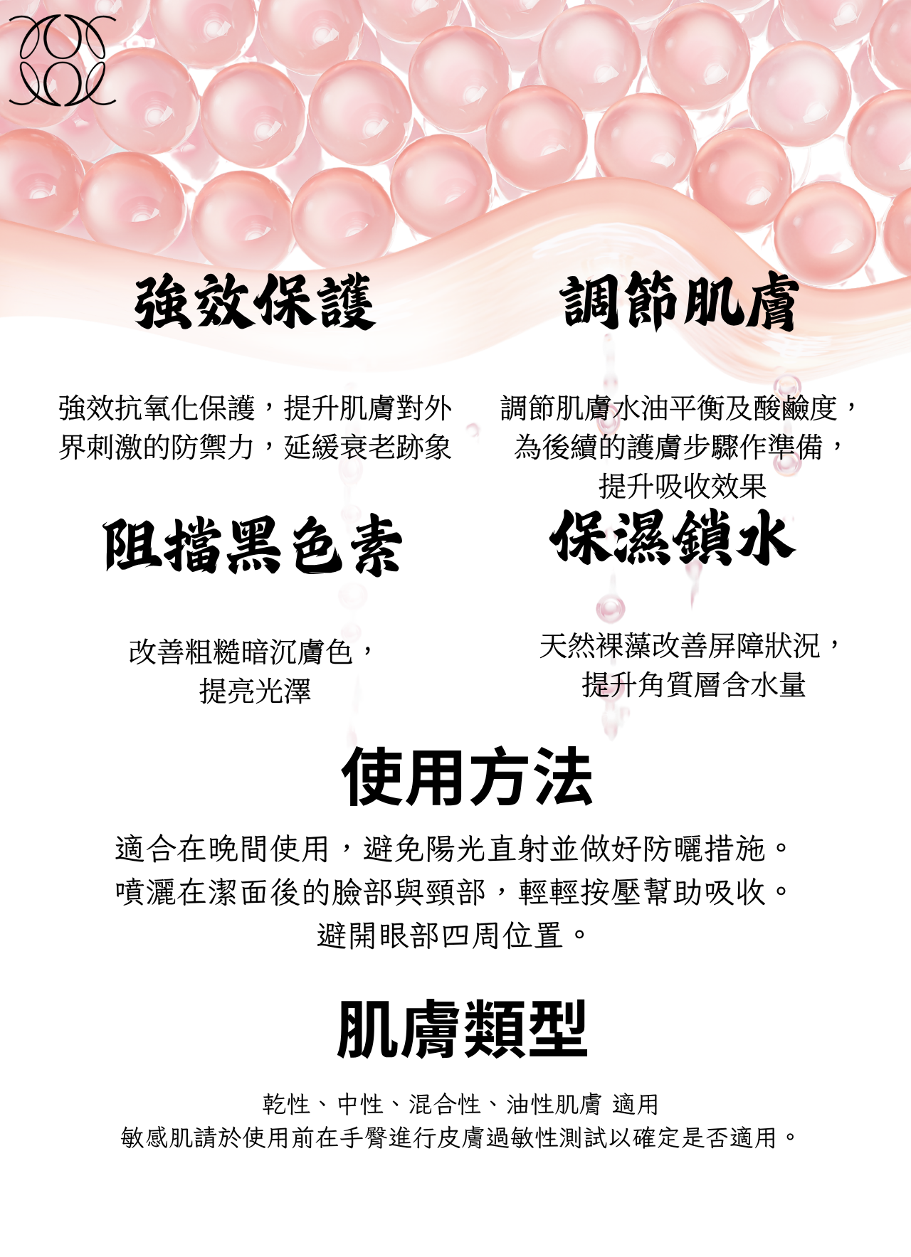 ·調節肌膚水油平衡及酸鹼度, 為後續的護膚步驟作準備,提升吸收效果。
