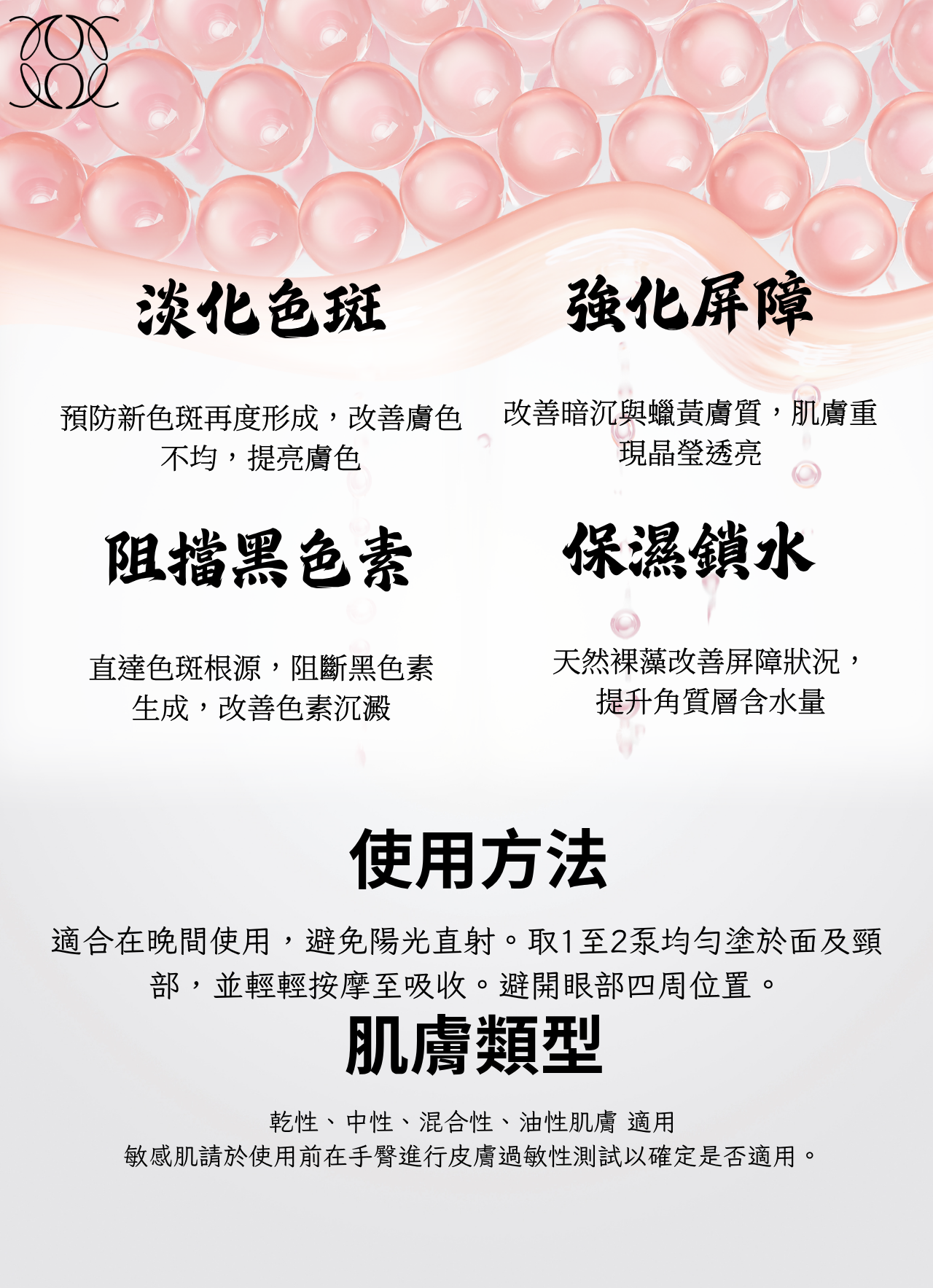 ·有效淡化色斑及痘印,預防新色斑再度形成,改善膚色不均,提亮膚色。